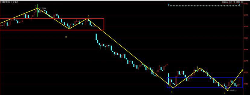 從走勢上分析,目前上證指數(shù)正在走30分鐘向下出中樞一筆,如果30分鐘出現(xiàn)向上回拉進(jìn)中樞的一筆就可以改變當(dāng)前的弱勢狀態(tài),那么走勢關(guān)鍵就在于30分鐘次級別5分鐘能否出現(xiàn)一個中樞背馳,導(dǎo)致30分鐘向下一筆停止下跌。