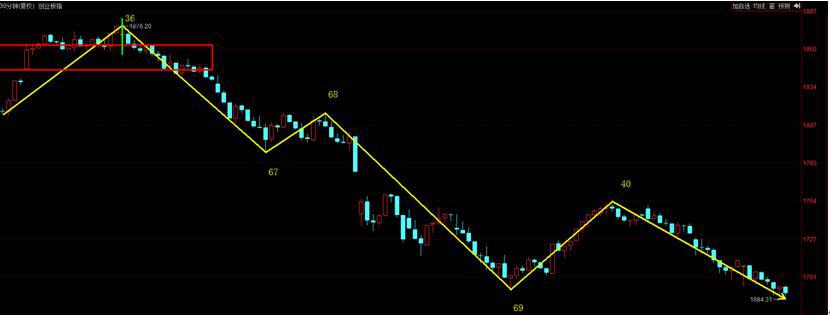 創(chuàng)業(yè)板指數(shù)的走勢同樣在走30分鐘級別向下一筆,創(chuàng)業(yè)板與上證指數(shù)的走勢一個差別就在于5分鐘級別走勢并沒有構(gòu)建出下跌中樞,因為5分鐘沒有構(gòu)建出下跌中樞,所以在現(xiàn)階段暫時也就無法判斷止跌的問題。