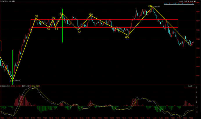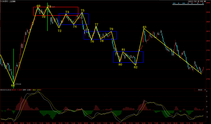 上證指數(shù)已經(jīng)連續(xù)調(diào)整五天,對應30分鐘級別圖型,就是70號點向下調(diào)整一筆。近期,上證指數(shù)30分鐘一直圍繞67-70中樞反復震蕩,接下來指數(shù)30分鐘存在兩種可能演變,一種就是70號點這筆大幅向下離開65-68中樞,形成中樞背馳,那么指數(shù)就有可能形成本輪調(diào)整以來的重要低點。還有一種走勢就是70號點向下一筆調(diào)整結(jié)束,形成類二買向上出中樞,之后形成30分鐘三買,那么指數(shù)就有可能形成比較有力度的反彈行情。無論是哪種走法,關注的焦點是70號點這一筆調(diào)整的結(jié)束,可以通過30分鐘的底分型停頓或者驗證分型來判斷。