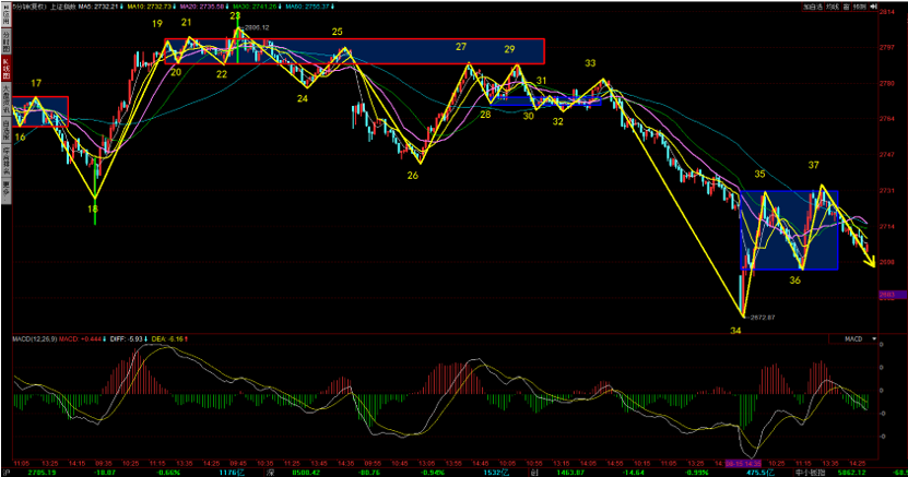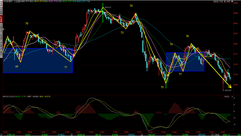 結(jié)合上證指數(shù)5分鐘圖形來看,接下來上證指數(shù)依然存在兩種可能走法,一種就是5分鐘類二買觸發(fā)的反彈,拉回30分鐘76-78中樞。還有一種就是5分鐘繼續(xù)向下,形成5分鐘中樞背馳。