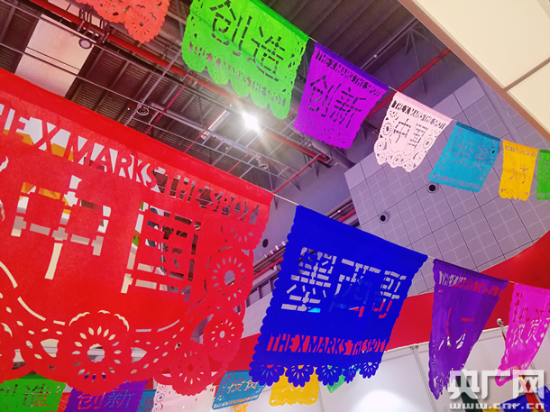 (“墨西哥”“中國(guó)”“創(chuàng)新”等五顏六色的剪紙掛滿(mǎn)了整個(gè)墨西哥展區(qū) 央廣網(wǎng)記者 王明月 攝)