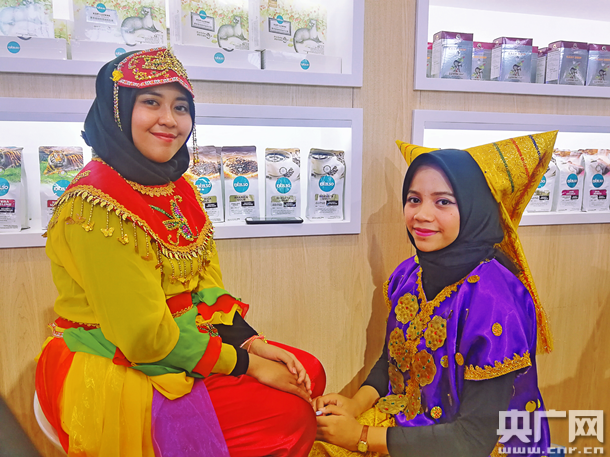 印度尼西亞展臺(tái)由一個(gè)咖啡吧做背景,身著傳統(tǒng)服飾的印度尼西亞女孩坐在搭建的咖啡吧后交談。印度尼西亞此次參展以可持續(xù)發(fā)展為主題,展品涵蓋了咖啡、棕櫚油、燕窩、熱帶水果和珠寶等特產(chǎn)品。在國(guó)家展之外,印度尼西亞的40余家企業(yè)獲得了900余平方米的進(jìn)博會(huì)展位。