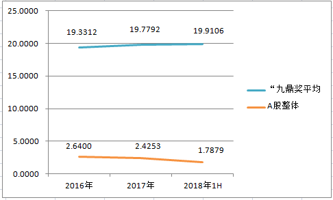 從榮獲了“九鼎獎”的9家上市公司的凈資產(chǎn)收益率(2018年為年化數(shù)據(jù),算術(shù)平均,下同)來看,不僅顯著高于A股所有公司的凈資產(chǎn)收益率平均值,而且在最近3年中指標(biāo)表現(xiàn)平穩(wěn);即便是在2018年上半年市場整體盈利壓力較大的條件下,這9家公司依然能夠錄得平穩(wěn)的凈資產(chǎn)收益率。