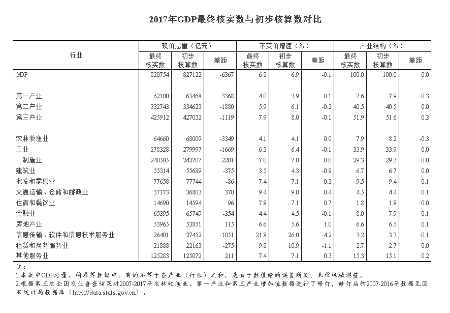 經(jīng)最終核實,2017年,GDP現(xiàn)價總量為820754億元,比初步核算數(shù)減少了6367億元;按不變價格計算,比上年增長6.8%,比初步核算數(shù)下降0.1個百分點。三次產(chǎn)業(yè)和各行業(yè)數(shù)據(jù)見附表。