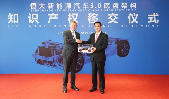 圖:恒大新能源汽車集團(tuán)與德國BENTELER集團(tuán)、FEV集團(tuán)簽訂3.0底盤架構(gòu)知識產(chǎn)權(quán)移交協(xié)議