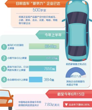 數(shù)據(jù)顯示,今年上半年,威馬EX5以交強險上牌量8548輛的成績,位居第一;小鵬汽車G3上牌量為8494輛,位居第二;蔚來汽車ES6、ES8兩款車?yán)塾嬌吓屏繛?656輛,位居第三;合眾哪吒N01上牌量為3814輛,位居第四。前四家銷量之和占比超過九成,其他企業(yè)的銷量均未超過千輛。