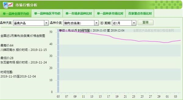 農(nóng)業(yè)農(nóng)村部對(duì)200個(gè)批發(fā)市場(chǎng)監(jiān)測(cè)調(diào)度數(shù)據(jù)顯示,12月1日豬肉價(jià)格為每公斤41.48元,比11月1日價(jià)格高峰的每公斤52.40元下降10.92元,降幅達(dá)20.84%。