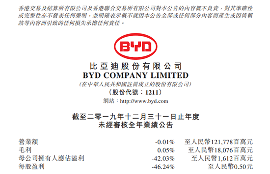 就在同一日,比亞迪發(fā)布的2019年度業(yè)績快報顯示,2019年全年比亞迪營業(yè)總收入為1217.78億元,較上年同期下降0.01%,歸屬于上市公司股東凈利潤為16.12億元,較上年同期下滑42.03%。