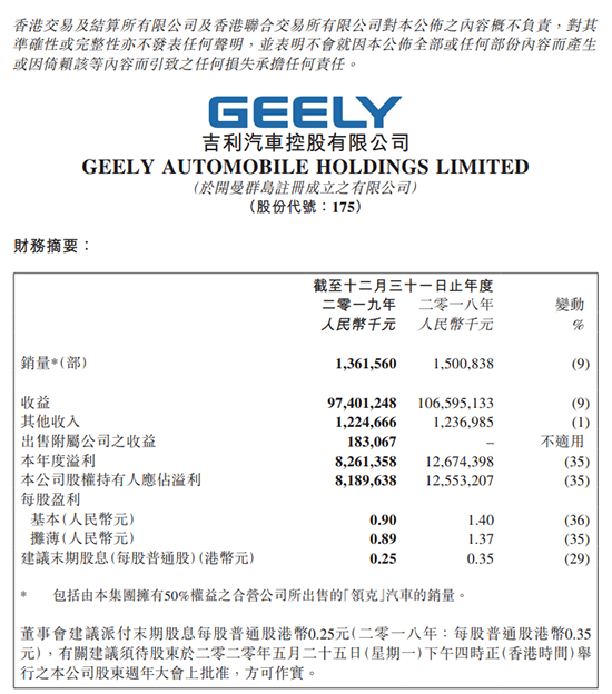 作為自主品牌的領軍企業(yè),吉利汽車和長城汽車也先后發(fā)布了2019年業(yè)績。2019年,吉利汽車營業(yè)收入為974億元,同比下滑9%;凈利潤為82.61億元,同比下滑35%;毛利率下滑2.8個百分點至17.4%。長城汽車營業(yè)總收入962.11億元,同比下降3%;凈利潤45.31億元,同比下降13.64%,歸屬于母公司股東凈利潤44.97億元。