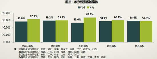 除東區(qū)外,其余地區(qū)庫存壓力基本延續(xù)上月狀態(tài)。其中,北區(qū)指數(shù)59.7%,微增0.5%;南區(qū)指數(shù)57.8%,下降8%,庫存壓力略有緩解。西區(qū)庫存預(yù)警指數(shù),則環(huán)比增長2%至60.1%;流通協(xié)會認(rèn)為,其庫存指數(shù)的增加與西區(qū)疫情、汛情抑制需求回暖不無關(guān)系。