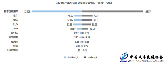 上半年,基本型乘用車共交易326.06萬輛,同比下降18.25%;SUV為 53.85萬輛,同比下降7.19%;MPV為32.57萬輛,同比下降25.02%;交叉型乘用車13.97萬輛,同比下降15.23%。商用車方面,客車交易量為48.02萬輛,同比下降31.60%;載貨車50.04萬輛,同比下降27.64%。