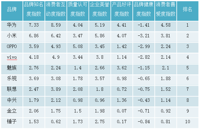 2016年手機(jī)自主商標(biāo)品牌消費(fèi)者喜愛度總指數(shù)表