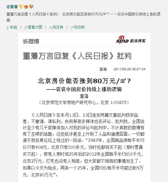 【導(dǎo)讀】董藩回應(yīng)《人民日報》質(zhì)疑,認(rèn)為北京房價漲多高都不奇怪。