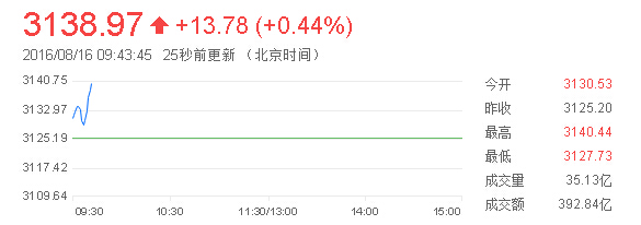 央廣網(wǎng)北京8月16日消息 據(jù)經(jīng)濟(jì)之聲《交易實(shí)況》報(bào)道,滬深兩市雙雙高開,滬指報(bào)3130.53點(diǎn),漲5.34點(diǎn),漲幅0.17%;深證成指報(bào)10845.62點(diǎn),漲23.51點(diǎn),漲幅0.22%;創(chuàng)業(yè)板指報(bào)2195.02點(diǎn),漲1.81點(diǎn),漲幅0.08%。