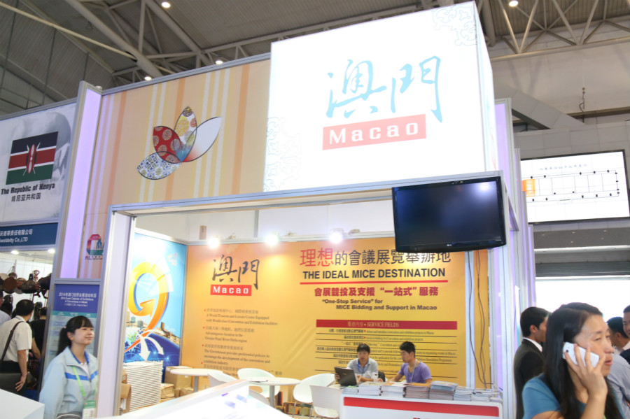 臺(tái)灣展臺(tái)上的工作人員正在邀請游客品嘗食品。