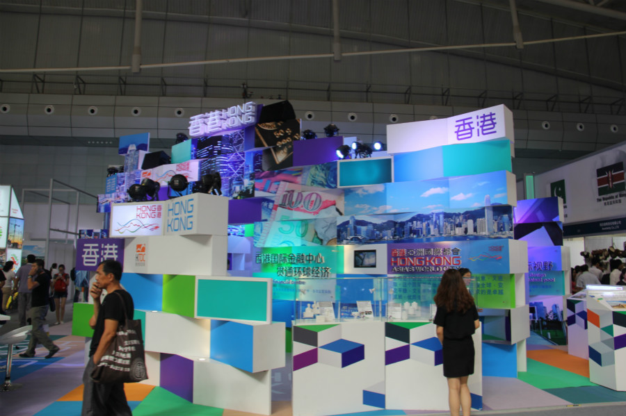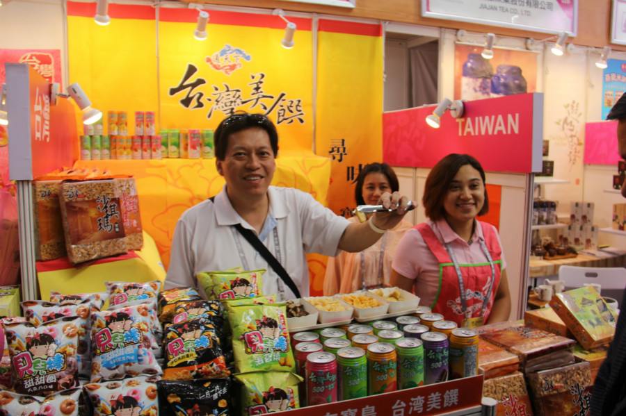 臺(tái)灣展臺(tái)上的工作人員正在邀請(qǐng)游客品嘗食品。