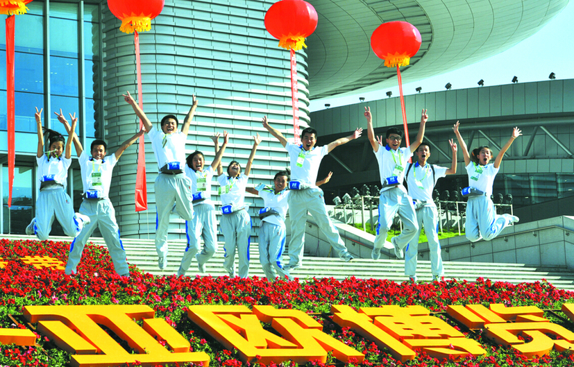 志愿者們?yōu)閬啔W博覽會成功舉辦助威。