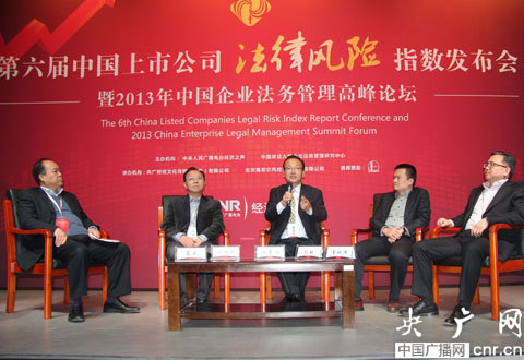(從左至右)國航總法律顧問 聶穎、中國政法大學(xué)商學(xué)院院長 孫選中、中央財(cái)經(jīng)大學(xué)金融證券研究所所長 韓復(fù)齡、百度技術(shù)有限公司法律部法務(wù)總監(jiān) 劉敏、中國人民保險(xiǎn)集團(tuán)股份有限公司法律合規(guī)部總經(jīng)理 李祝用(央廣網(wǎng) 李靜/攝)