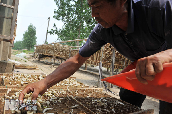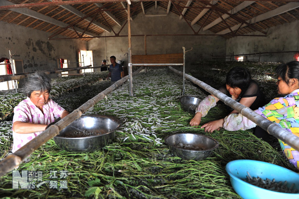 中廣網(wǎng)南京6月6日消息 幾名農(nóng)民“鐘點工”當日在幫助一家養(yǎng)蠶大戶進行上蔟管理。在鹽城市射陽縣特庸鎮(zhèn)九里村,桑蠶養(yǎng)殖業(yè)已成為農(nóng)民增收的主要支柱產(chǎn)業(yè),蠶農(nóng)養(yǎng)殖大量的桑蠶,導致勞動力緊缺。農(nóng)民“鐘點工”應運而生,既幫助養(yǎng)蠶大戶解決了人力不足的困難,又在家門口實現(xiàn)了就業(yè)。(胡劍歡 攝)