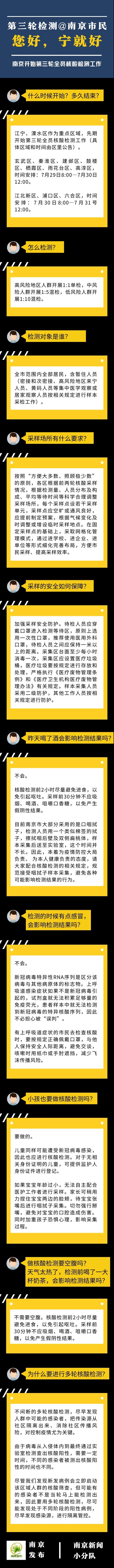 7月28日,南京發(fā)布關(guān)于開展第三輪全市全員核酸檢測的通告(第8號)。7月29日,南京發(fā)布第三輪全市全員核酸檢測相關(guān)情況問答。