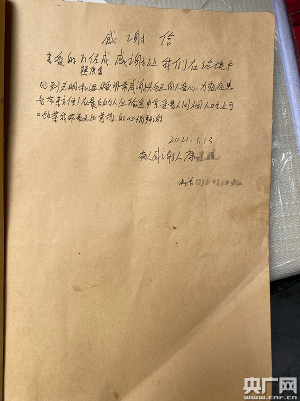 病人家屬手寫(xiě)的感謝信(央廣網(wǎng)記者 謝元森 攝)