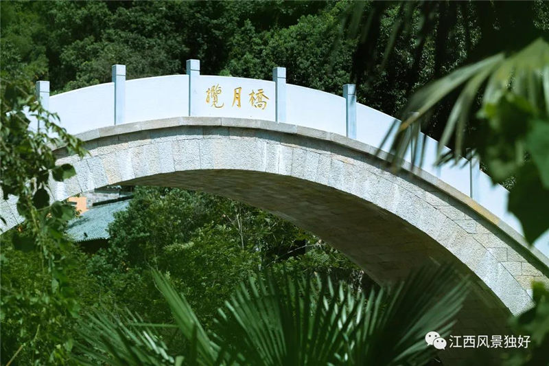 說到河與水,自然也就離不開橋。在景區(qū)入口處,有一座紅色單拱鋼結(jié)構(gòu)大橋,拱橋坡度較小,游客走在上面如同“平步青云”,其橋名也正是“青云橋”。穿過青云橋,來到一座風(fēng)雨廊橋,廊橋采用的是抬梁式架構(gòu),整個(gè)結(jié)構(gòu)和工藝富有江西地方特色。峽谷中段,有一座高空鋼架橋橫跨峽谷上空,中間懸有“望仙谷”三個(gè)大字,橋雖顯簡(jiǎn)單但似乎又帶點(diǎn)粗獷美。在眾橋中,若說誰最美,攬?jiān)聵虍?dāng)仁不讓。它是一座石拱橋,取材于當(dāng)?shù)氐幕◢弾r,由百層方石堆砌而成,遠(yuǎn)看就像一輪彎彎的新月。圓月夜里,圓圓的拱橋可將溪谷中的月亮倒影一攬而入,這也是為何取名“攬?jiān)聵颉钡木壒省?/p>