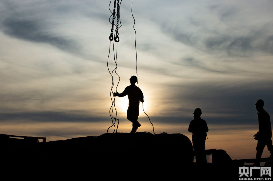日落余暉,霞光萬丈,鐵臂揮舞,相得益彰。