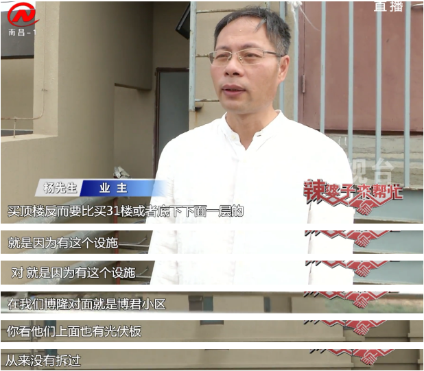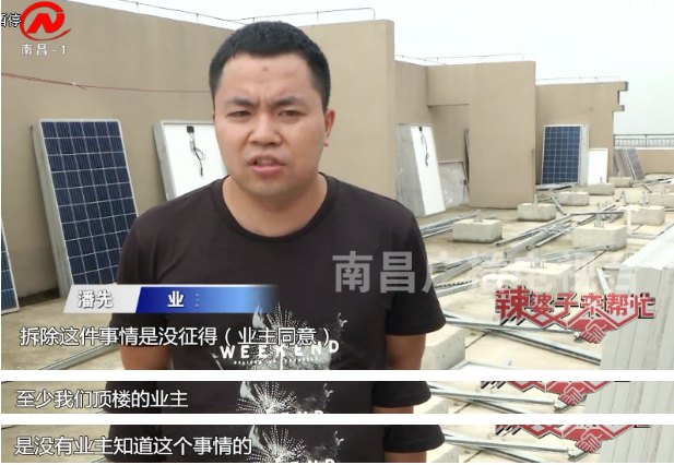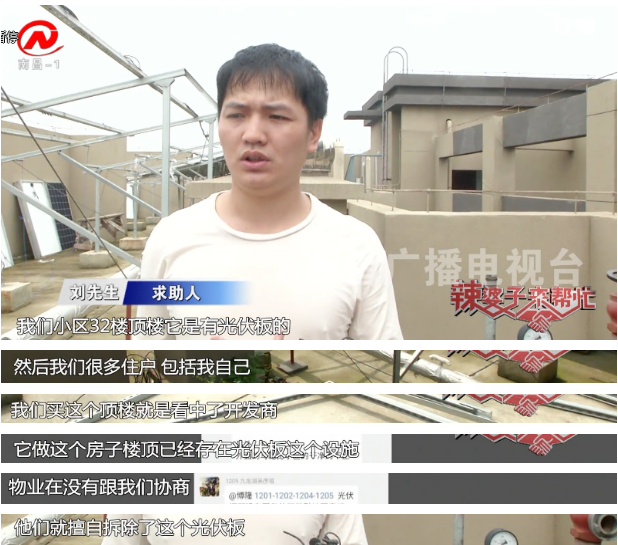 業(yè)主稱在收房時(shí),光伏板就是作為其中一個(gè)驗(yàn)收標(biāo)準(zhǔn)交到業(yè)主手上,如今劉先生入住已一年有余,原本可以起到隔熱防水的光伏板卻在今年6月被強(qiáng)制拆除,這讓居住在頂樓的業(yè)主們感到十分不解。
