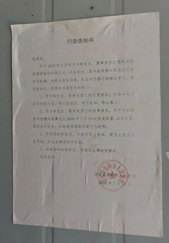 記者調(diào)查發(fā)現(xiàn),7月24日,泉嶺鄉(xiāng)政府下發(fā)了《行政告知書》,明確鄉(xiāng)政府與泉嶺鄉(xiāng)園藝場場長徐長水簽訂的《經(jīng)營協(xié)議》于2018年12月30日到期,此后徐長水與簡建輝簽訂的《土地承包協(xié)議》應(yīng)屬無效。
