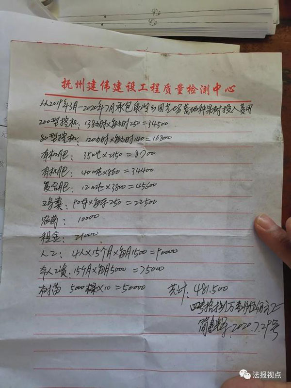 8月13日上午,進(jìn)賢縣泉嶺鄉(xiāng)園藝場上一片繁忙的施工景象,只見多輛推土機、挖掘機、后八輪正在平整土地?吹焦さ厣弦粋個連根拔起的樹兜樹根,簡建輝愁眉蹙額,內(nèi)心五味雜陳。據(jù)他介紹,2019年2月6日,他與泉嶺鄉(xiāng)園藝場簽訂了《土地承包協(xié)議》,租賃了60余畝土地用于栽種柑桔,租金10496元/年,并預(yù)付了兩年2萬余元租賃費(租賃期限待鄉(xiāng)政府確認(rèn)后再行確定)。