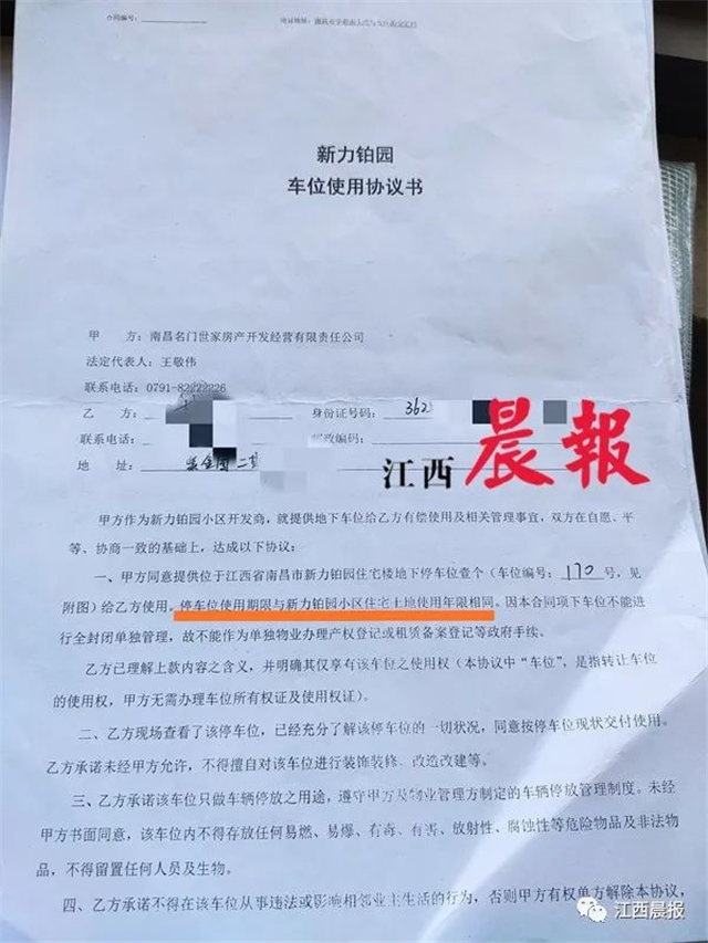 使用年限方面,該協(xié)議書規(guī)定,“停車位使用期限與新力鉑園小區(qū)住宅土地使用年限相同”。其中,新力鉑園小區(qū)住宅土地使用年限為70年。即意味著,170號(hào)停車位的使用期限也為70年。