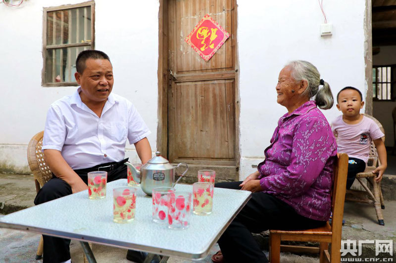 陳石俊在看望村里的貧困戶謝堯鳳(央廣網(wǎng)發(fā) 通訊員尹其奇 攝)