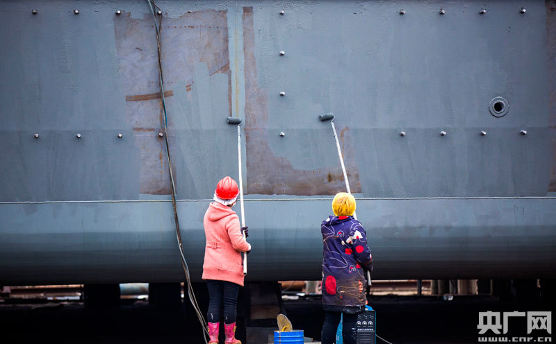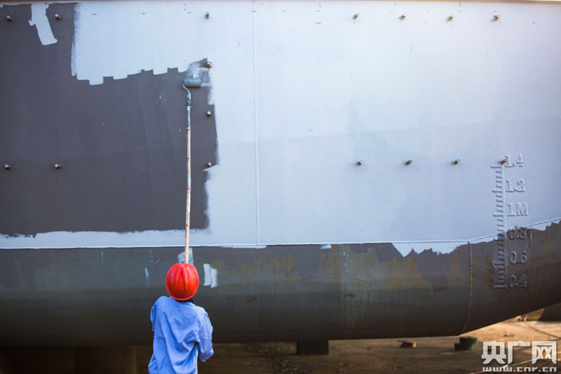 3月4日,江西省九江市都昌縣造船總廠有限公司的工人們?cè)谶M(jìn)行船體刷漆作業(yè)