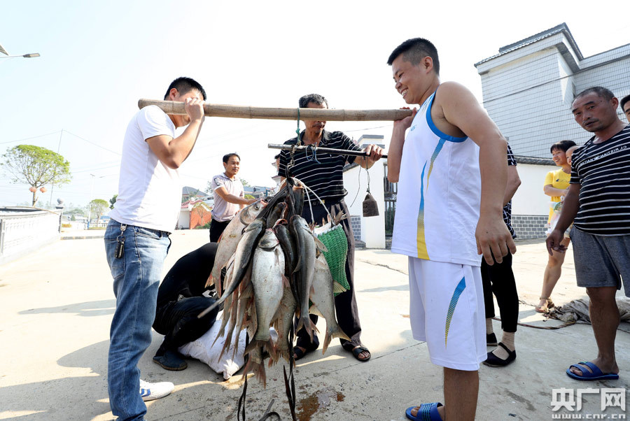 3個鐘頭下來,打魚的人紛紛撐筏靠岸,把魚從水里拖出來,再抬上岸,過稱后,打魚的人家還要分“網(wǎng)費(fèi)”(所謂“網(wǎng)費(fèi)”就是打魚人的報酬)。“有一種收獲的感覺,特別有成就感!苯衲甑拇螋~冠軍熊學(xué)飛說,他打了260斤重魚。全部過稱算好“網(wǎng)費(fèi)”,再把魚大小搭配,按戶頭分好股,大家等待分魚。