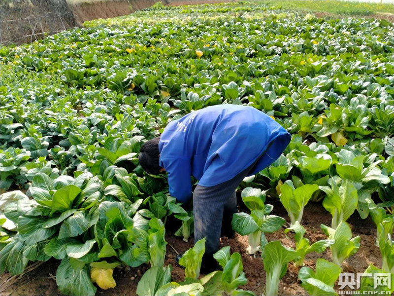 熊龍焱在自種的菜園摘菜準(zhǔn)備喂雞