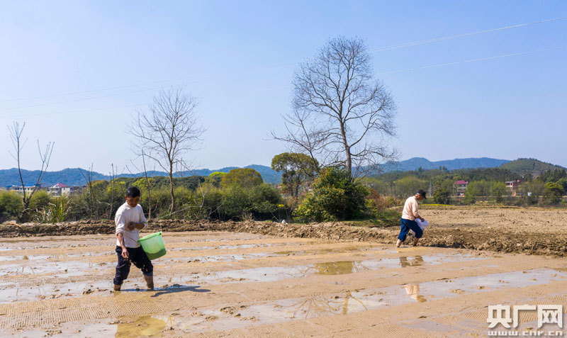 3月20日,江西省九江市都昌縣陽(yáng)峰鄉(xiāng)農(nóng)民在田間直播早稻