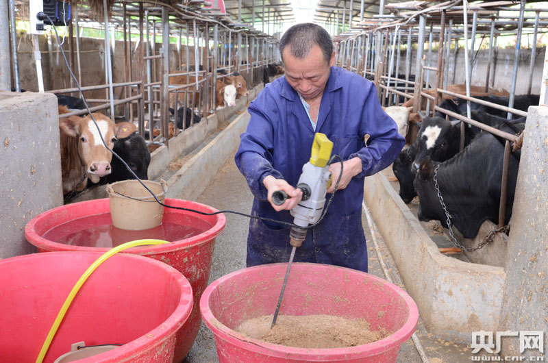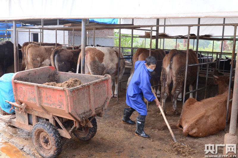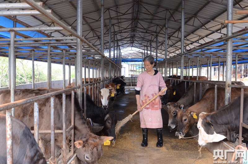 “我沒事的時(shí)候就來這里做事,事也輕松,做一天會(huì)有50元的工錢呢!闭谂诶锩χo牛喂飼料的貧困戶鄧發(fā)英笑著說道。