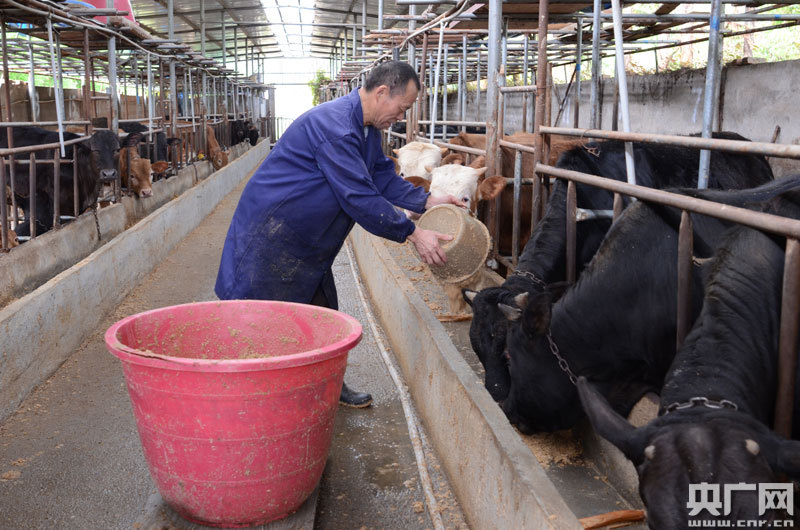 村民正在給牛喂飼料