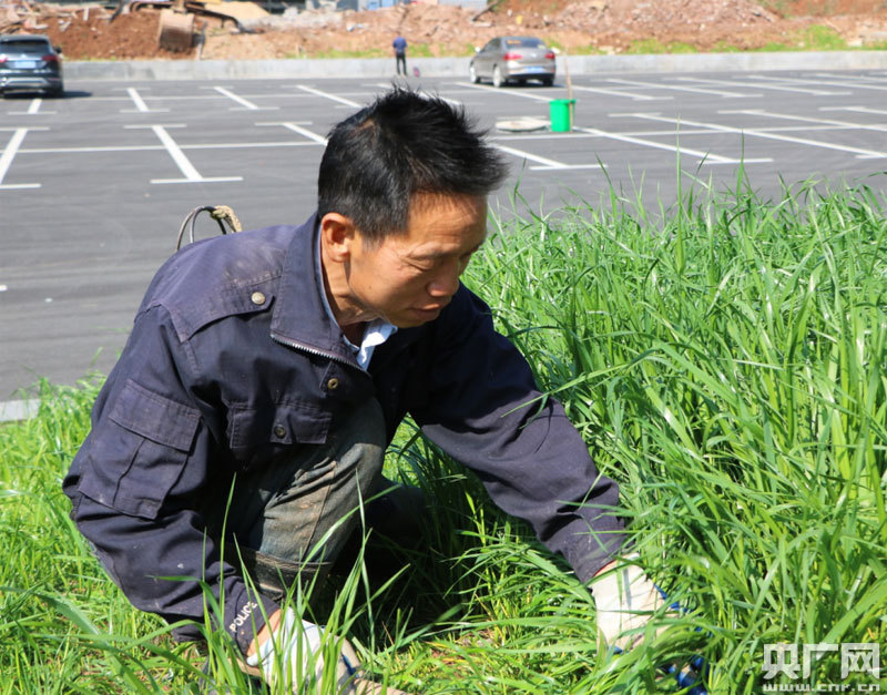 廖柏萍正在割種在魚(yú)塘旁的魚(yú)草