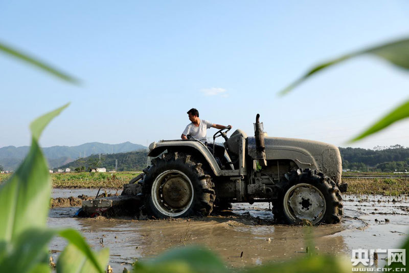 村民使用機械化設(shè)備翻耕稻田栽插早稻。(央廣網(wǎng)發(fā) 通訊員尹其奇 攝)