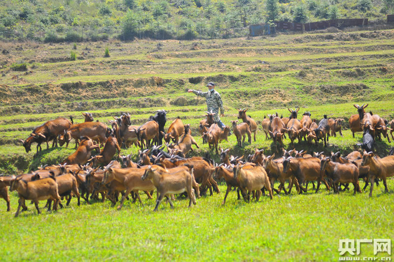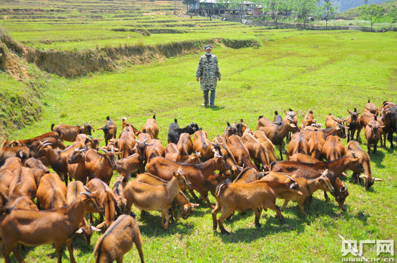 央廣網(wǎng)全南4月16日消息(記者王一凡 通訊員通訊員陳聲年 馬繼安)4月16日。在江西省贛州市全南縣中寨鄉(xiāng)筠竹村下朱屋扶貧產(chǎn)業(yè)基地,朱長生高興地在山間放著他的一百多只山羊。