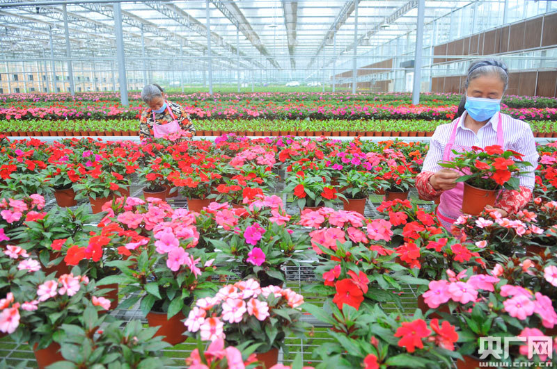 4月21日,在江西省贛州市全南縣城廂鎮(zhèn)黃埠村花卉種植扶貧產(chǎn)業(yè)基地,貧困戶黃六美、曹華萍正在整理準備外銷的鳳仙花。