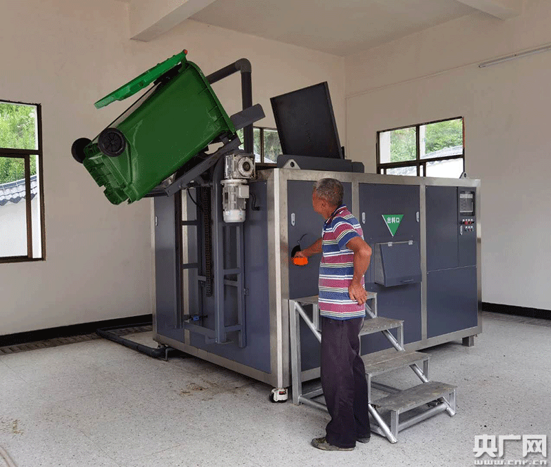 在南陽(yáng)鄉(xiāng)垃圾分類處理站,一臺(tái)智能餐廚垃圾就地處理設(shè)備正在運(yùn)行。工作人員將垃圾桶放置在升降機(jī)上,按動(dòng)操作按鈕,投料倉(cāng)自動(dòng)打開,桶自動(dòng)升起,餐廚垃圾被倒入投料倉(cāng),整個(gè)處理過(guò)程只需幾個(gè)小時(shí)就可以完成。