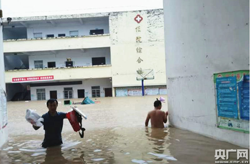 7月8日,蘇山鄉(xiāng)衛(wèi)生院醫(yī)務人員蹚水轉(zhuǎn)運醫(yī)療設備和藥品(央廣網(wǎng)發(fā) 通訊員吳振中 供圖)