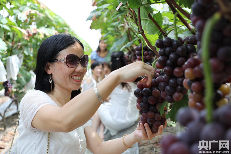 游客在月秀生態(tài)果園內(nèi)采摘葡萄(央廣網(wǎng)發(fā) 通訊員尹其奇 攝)