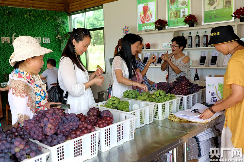 游客在月秀生態(tài)果園內(nèi)品嘗葡萄(央廣網(wǎng)發(fā) 通訊員尹其奇 攝)