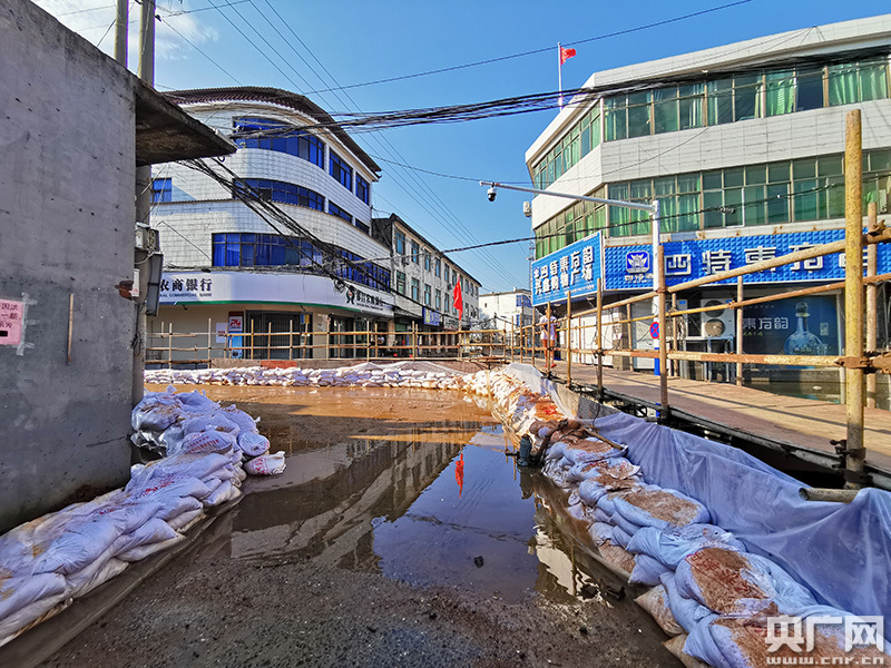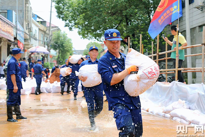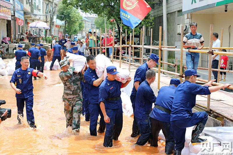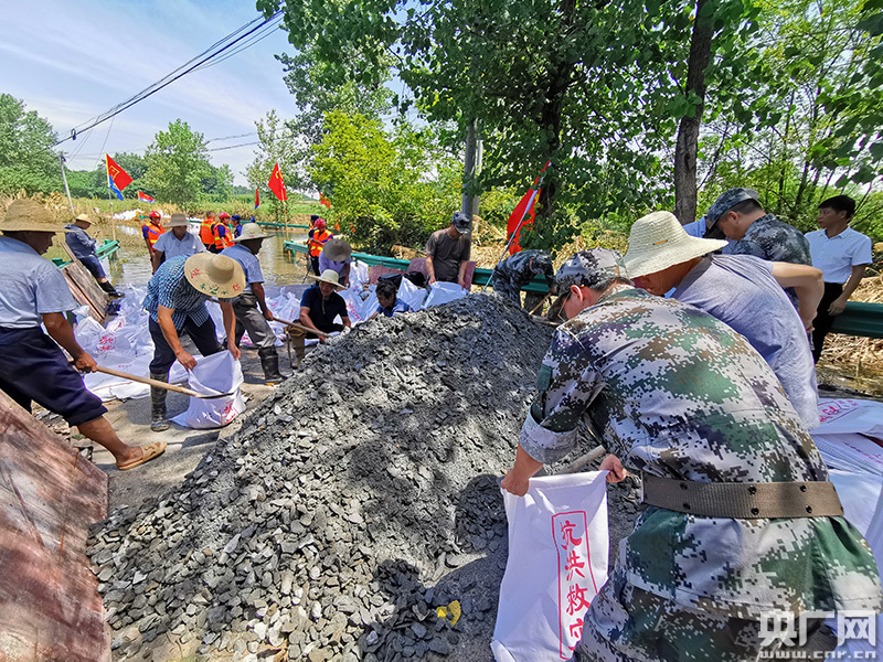 救援隊(duì)員與當(dāng)?shù)剜l(xiāng)村干部群眾一起在集鎮(zhèn)街道修筑圍堰(央廣網(wǎng)發(fā) 通訊員 提供)
