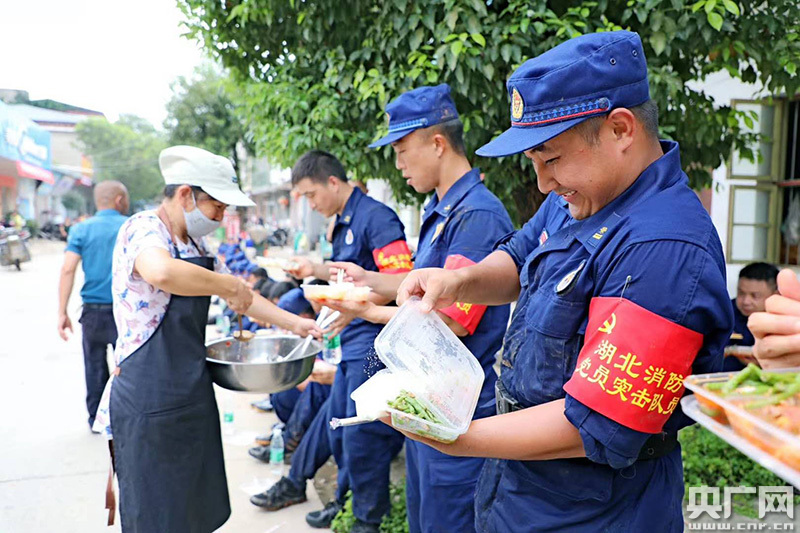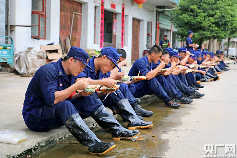 救援隊(duì)員紀(jì)律嚴(yán)明,自帶盒飯,席地而坐(央廣網(wǎng)發(fā) 通訊員 提供)