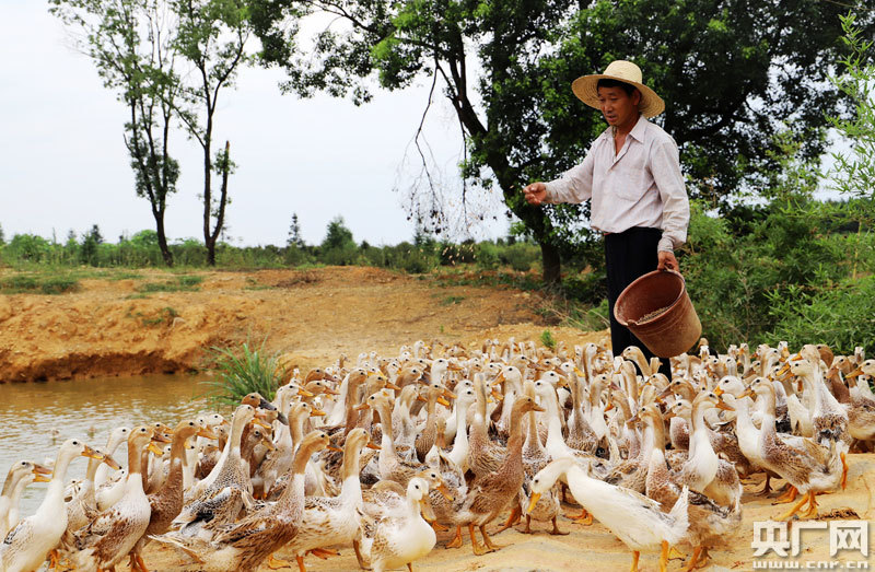 安?h洲湖鎮(zhèn)汶源村王三傳在喂鴨(央廣網(wǎng)發(fā) 通訊員劉麗強 攝)