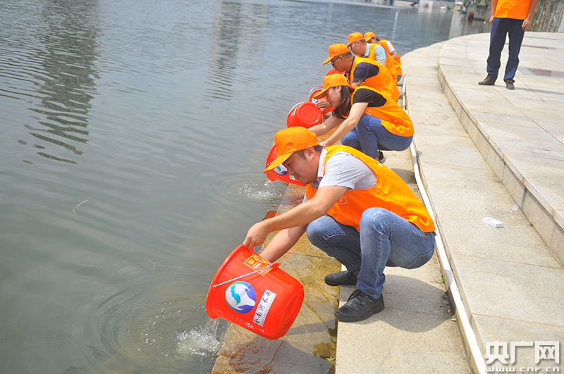 河長制管理志愿者們進(jìn)行魚苗放生,凈化水質(zhì)(央廣網(wǎng)發(fā) 通訊員陳聲年 攝)